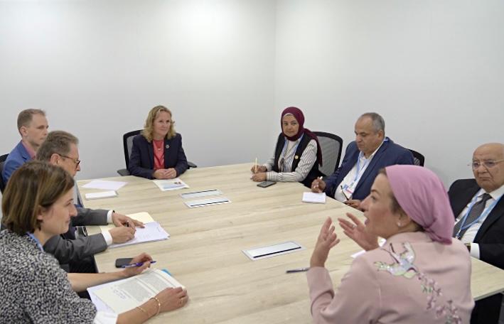 التقت اليوم الدكتور ياسمين فؤاد وزيرة البيئة المنسق الوزارى ومبعوث مؤتمر المناخ بالسيدة شتيفي ليمكه وزيرة البيئة وحماية الطبيعة الألمانية، لبحث التعاون الثنائي بين البلدين فى مجالات التكيّف، وصون التنوع البيولوجى، وذلك ضمن سلسلة لقاءاتها الثنائية خلال يوم التنوع البيولوجي ضمن الأيام الموضوعية لمؤتمر المناخ COP27 بمدينة شرم الشيخ.