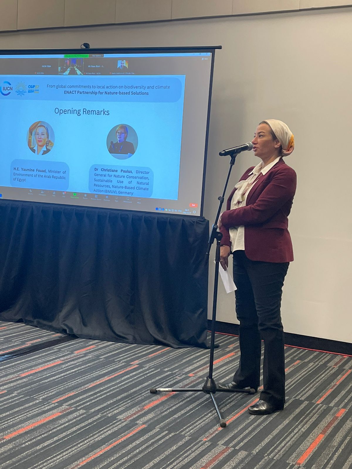 عقدت الدكتورة ياسمين فؤاد وزيرة البيئة مؤتمرا صحفيا حول اعلان شراكة مبادرة ENACT للحلول القائمة على الطبيعة، بمشاركة الدكتورة كريستيان بولوس، مدير عام الحفاظ على الطبيعة والاستخدام المستدام للموارد الطبيعية والعمل المناخي القائم على الطبيعة (BMUV) بألمانيا، وذلك على هامش فعاليات مؤتمر الأطراف لاتفاقية الأمم للتنوع البيولوجي COP 15 المنعقد بكندا.