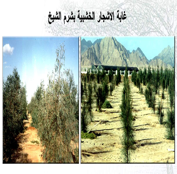 الصنوبريات – الكايا(الماهوجنى الافريقى )والكافور ، الاكاسيا، الكازوارينا، والسيسال والتوت لانتاج الحرير والكونوكاربس والبامبو والجاتروفا لانتاج الوقود الحيوى والترمناليا والحور وبعض نباتات الزينه